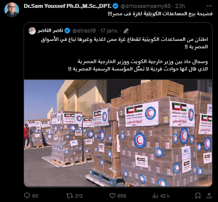 تزعم هذه المنشورات، المرفقة بصورة لحمولة مساعدات كويتية مُوجهة لقطاع غزة، أن السلطات المصرية تقوم بالاستيلاء على المساعدات الإنسانية وتبيعها في الأسواق.
