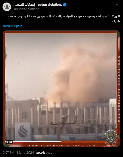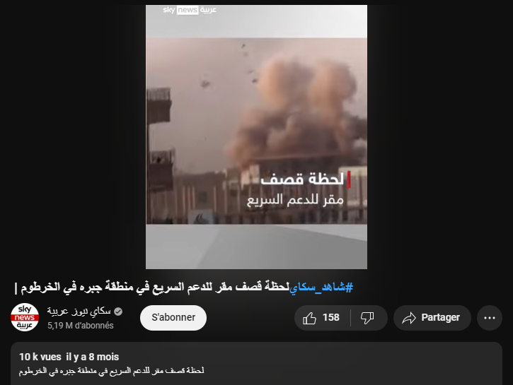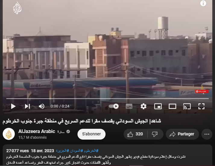 - تم نشر الفيديو في 18 أبريل 2023، ويُظهر لحظة قصف مقر للدعم السريع في منطقة جبره في العاصمة السودانية الخرطوم.