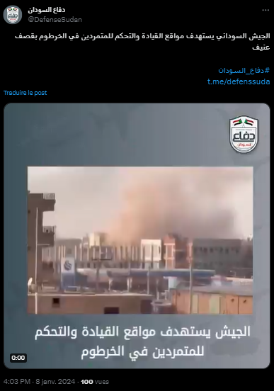 ويزعم الفيديو المعني أنه يتعلق باستهداف الجيش السوداني لمواقع القيادة والتحكم للمتمردين (قوات الدعم السريع) في العاصمة الخرطوم، من خلال قصف عنيف. وحصد مقطع الفيديو آلاف المشاهدات على منصة إكس (تويتر سابقا).
