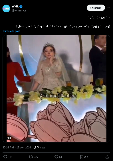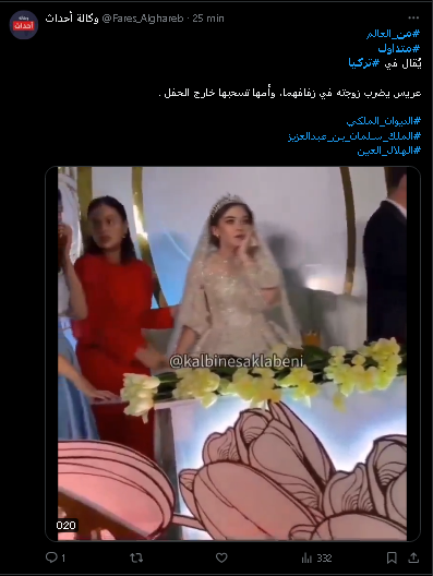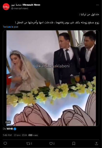 تتداول حسابات وصفحات على موقع التواصل الاجتماعي إكس، حديثًا، مقطع فيديو ادّعى ناشروه أنّه يُظهر زوجًا يصفع زوجته بكف في يوم زفافهما في تركيا، مما دفع الأم للتدخل وإخراج ابنتها من الحفل.