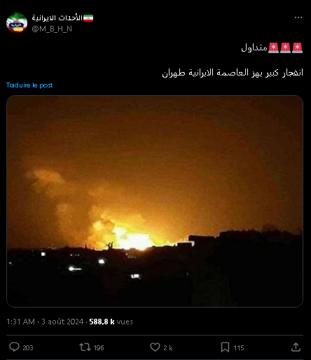 في هذا السياق، يتداول مستخدمو موقع التواصل الاجتماعي إكس صورة يدّعون أنها لانفجار كبير هز العاصمة الإيرانية طهران مؤخرًا.