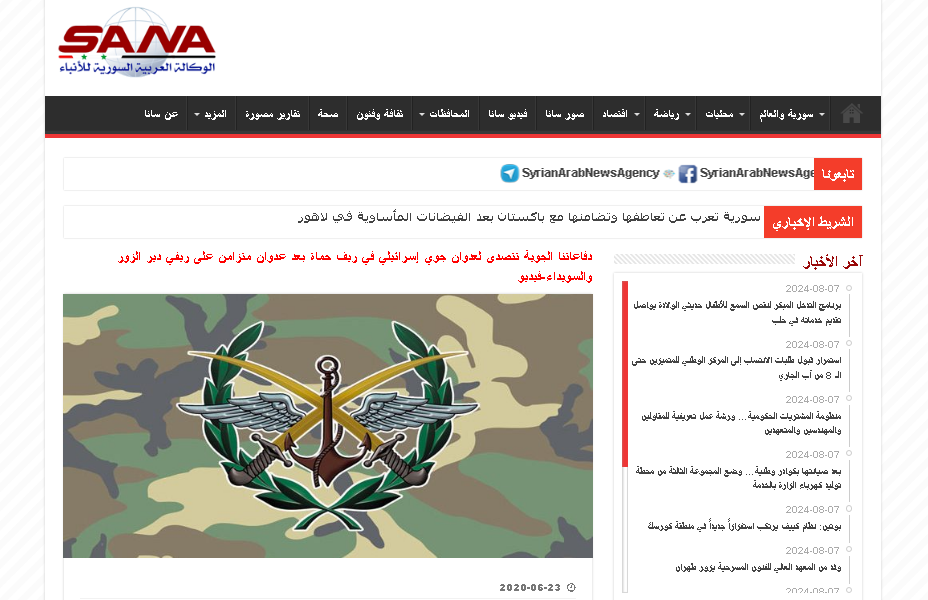 كما ذكرت “سانا” نقلاً عن مصدر عسكري أنه “في تمام الساعة 00:45، نفذ العدو الإسرائيلي عدواناً جوياً جديداً استهدف فيه عدة مواقع في السلمية والصبورة بريف حماة”، مشيرًا إلى أنه فور اكتشاف الصواريخ المعادية، تعاملت وسائط الدفاع الجوي معها وعملت على ملاحقتها واستهدافها وإسقاط عدد كبير منها قبل وصولها إلى أهدافها، حيث اقتصرت الأضرار على الماديات.