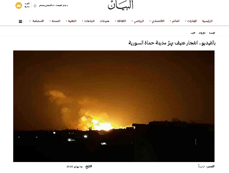 الصورة نُشرت على وسائل الإعلام وفي مواقع التواصل الاجتماعي في 24 يونيو/حزيران، وتعود لقصف جوي إسرائيلي استهدف مواقع في حماة السورية.