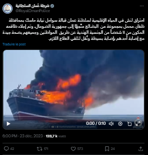 خلال عملية التحقق من صحة الفيديو المنتشر، تمكنا من الوصول إلى مقطع آخر تم التقاطه من زاوية مختلفة للسفينة نفسها، والذي تم نشره على حساب الشرطة العُمانية السلطانية غ-فعلى منصة X (تويتر سابقا) في تاريخ 23 ديسمبر 2023. ووفقًا للتفاصيل المقدمة في المنشور، يُظهر الفيديو احتراق سفينة في المياه الإقليمية لسلطنة عمان، قبالة سواحل نيابة حاسك في محافظة ظفار، والتي كانت في طريقها إلى جمهورية الصومال.
