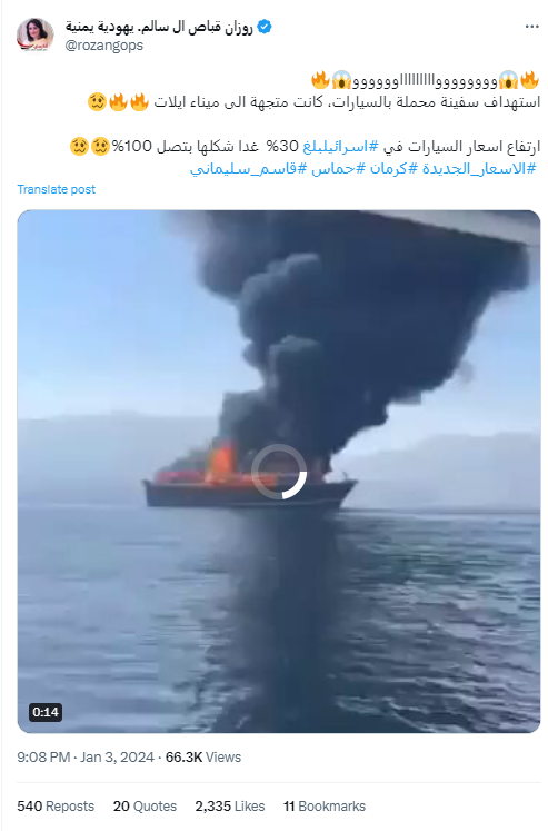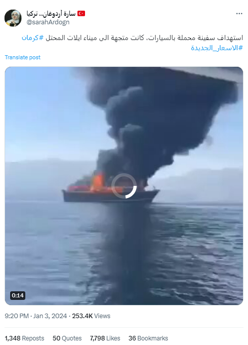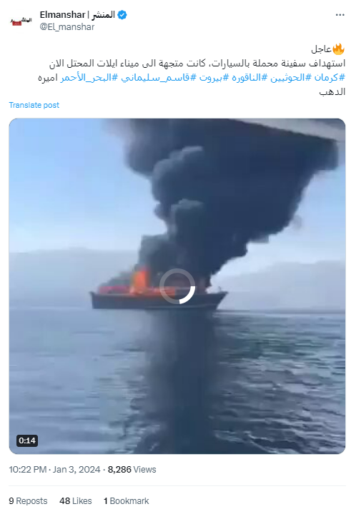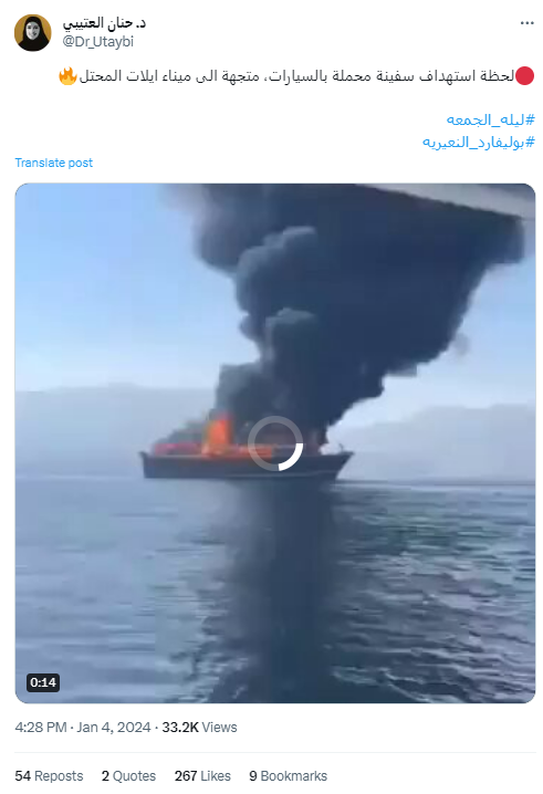 ويزعم الفيديو المعني أنه يتعلق باستهداف سفينة تحمل سيارات، والتي كانت متجهة إلى ميناء إيلات في إسرائيل. وحاز مقطع الفيديو أيضا على آلاف المشاهدات على منصة إكس.