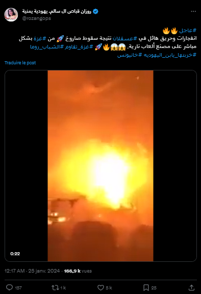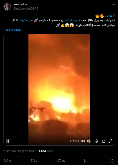 يُزعم المنشور الذي قمنا بالتحقق من صحته، أن مقطع الفيديو يظهر انفجارات وحريقًا هائلًا في عسقلان بإسرائيل نتيجة سقوط صاروخ من قطاع غزة بشكل مباشر على مصنع للألعاب النارية.