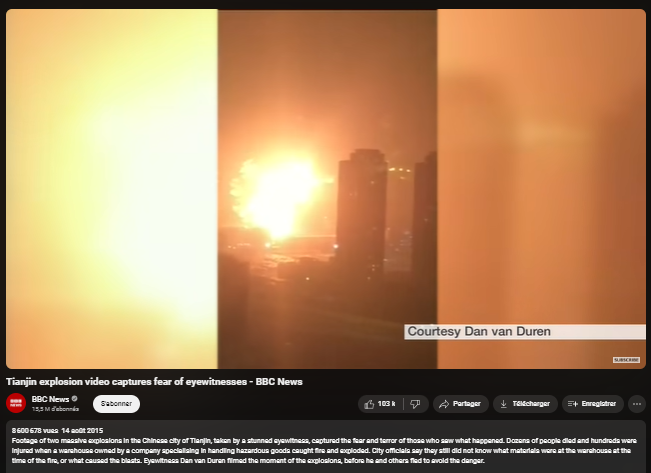 - تم نشر الفيديو في 15 أغسطس 2015، ويُظهر انفجارًا في مدينة تيانجين الصينية.