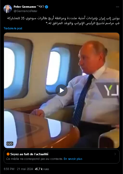 وزعم ناشرو الفيديو أن بوتين يتجه إلى إيران وسط إجراءات أمنية مشددة، حيث ترافقه أربع طائرات سوخوي 35، للمشاركة في مراسم تشييع الرئيس الإيراني والوفد المرافق له.