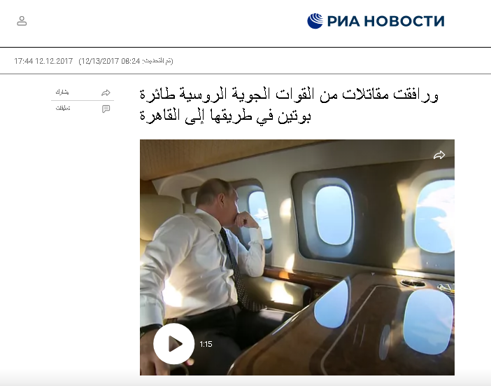 وعند الاستمرار في البحث باللغتين الإنجليزية والروسية، نجد تقريرا لوكالة سبوتنيك -وهي وكالة إعلامية روسية أخرى- بتاريخ ديسمبر 2017. يفيد هذا التقرير أن بوتين زار العاصمة المصرية القاهرة بعد زيارته لقاعدة حميميم الجوية في غرب سوريا في 11 ديسمبر 2017. لذا، وكما يتبين من هنا، فإن الفيديو لا يظهر الرئيس الروسي بوتين وهو في طريقه لحضور جنازة الرئيس الإيراني.