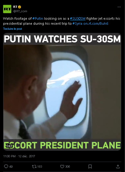 وجاء في نص المنشور ما يلي: “شاهد لقطات لطائرة مقاتلة من طراز SU30SM ترافق الطائرة الرئاسية خلال زيارة بوتين الأخيرة إلى سوريا”.