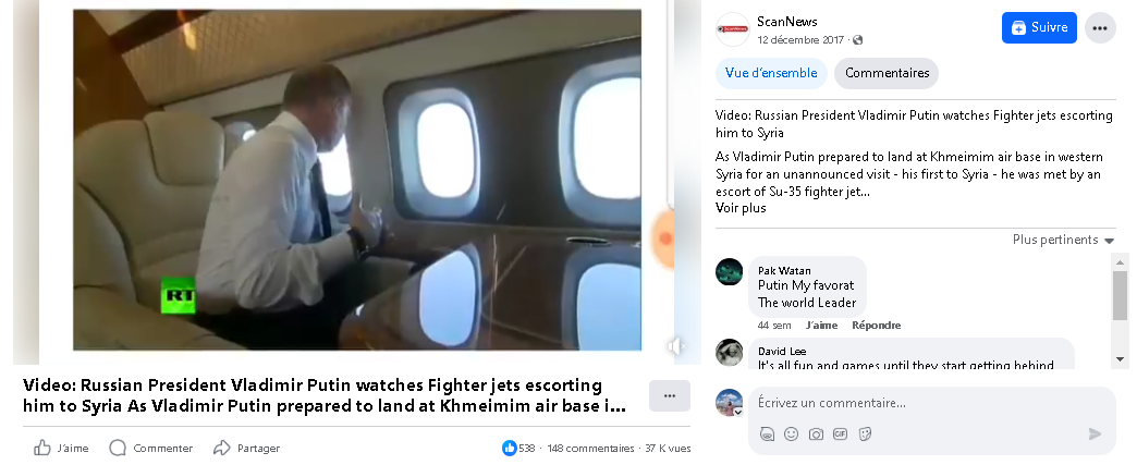 ومع ذلك، بينما نواصل البحث، نجد النسخة الطويلة من فيديو الادعاء في منشور ScanNews على فيسبوك في ديسمبر 2017. وفي النص الوصفي لهذا المنشور، يُشار إلى أن الرئيس الروسي فلاديمير بوتين كان يستعد للهبوط في قاعدة حميميم الجوية في غرب سوريا خلال زيارته الأولى غير المعلنة إلى سوريا، حيث كانت طائرات Su-35 ترافقه. ويُذكر أيضًا في النص أن بوتين كان يحني رقبته للحصول على رؤية أفضل من الطائرة Il-96 التي كان على متنها، وأن هذه القاعدة كانت مركزًا للعمليات العسكرية الروسية في سوريا على مدى السنتين الماضيتين.