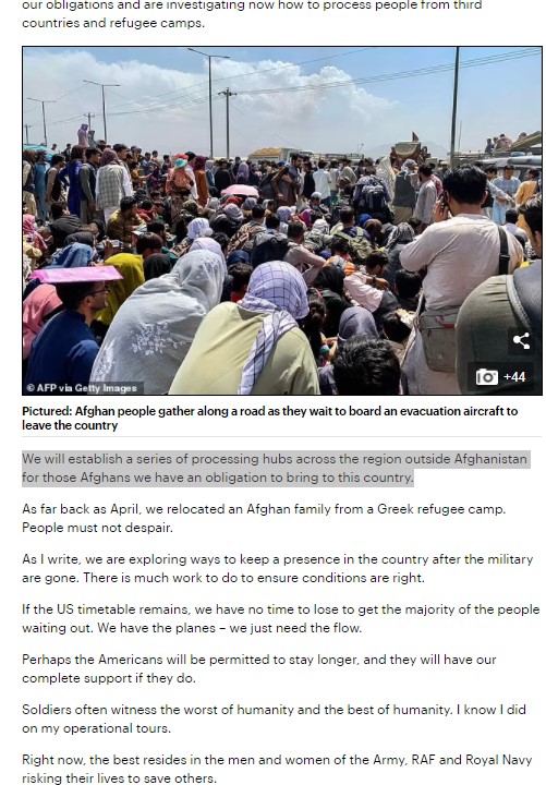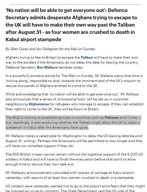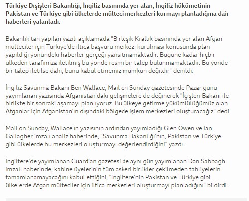 İngiltere Savunma Bakanı Ben Wallace’in makalesinde Türkiye ve Pakistan dair herhangi bir ifade yer almamaktır. Fakat bu makalenin hemen altında yer alan Glen Owen ve Ian Gallagher’ın analiz yazısında İngiltere Savunma Bakanlığı’nın Türkiye ve Pakistan’da Afganlar için mülteci merkezi kurulacağını düşündüğü belirtildi. Bu da bu kafa karışıklığına sebep olabilir.
