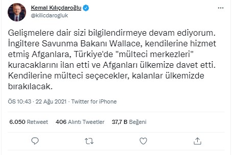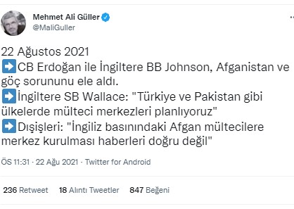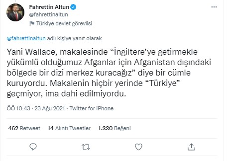 İddianın bu kadar yayılmasıyla Cumhurbaşkanlığı İletişim Başkanı Fahrettin Altun Twitter’dan bir açıklama yayınladı. Altun Wallace’in makalesinin hiçbir yerinde Türkiye ve Pakistan kelimelerine yer vermediğini belirtti. (4.Görsel) Türkiye Cumhuriyeti Dışişleri Bakanlığı da İngiltere basınında yer alan Türkiye’de Afganlar için mülteci merkezleri kuruluyor iddiasının gerçeği yansıtmadığına dair bir açıklama yaptı. (5.Görsel)