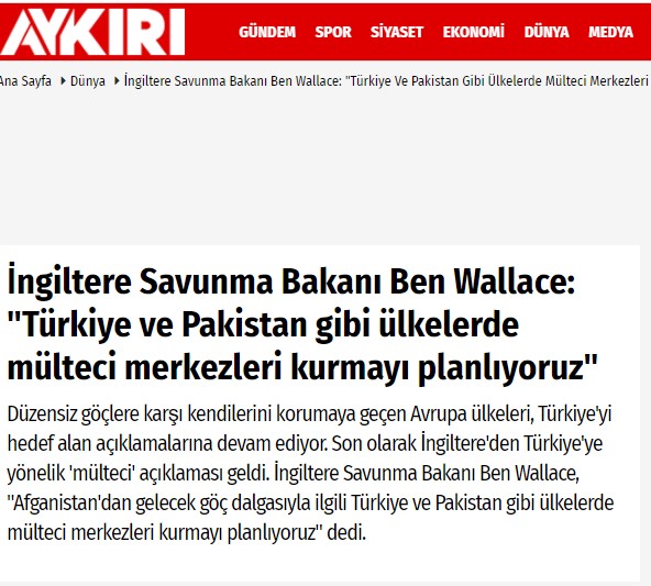 Bazı haber sitelerinde ve sosyal medya hesaplarında yer alan iddiaya göre İngiltere Savunma Bakanı Ben Wallace’in The Mail on Sunday’de yayınladığı makalede Türkiye ve Pakistan gibi ülkelerde mülteci merkezi kurmayı planladıklarını açıkladı. İddia Sputnik’te, Cumhuriyet’te, Aykırı’da ve Gazete Duvar’da  yer aldı. Cumhuriyet Halk Partisi lideri Kemal Kılıçdaroğlu da kendi Twitter hesabından bu makalede bu ifadenin yer aldığını belirtti. İddiaya dair Ekşi Sözlük’te de başlık açıldı. Bu kadar yayılmasıyla iddia Türkiye gündeminde yer aldı.