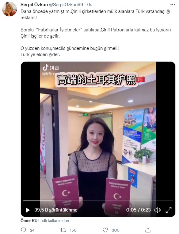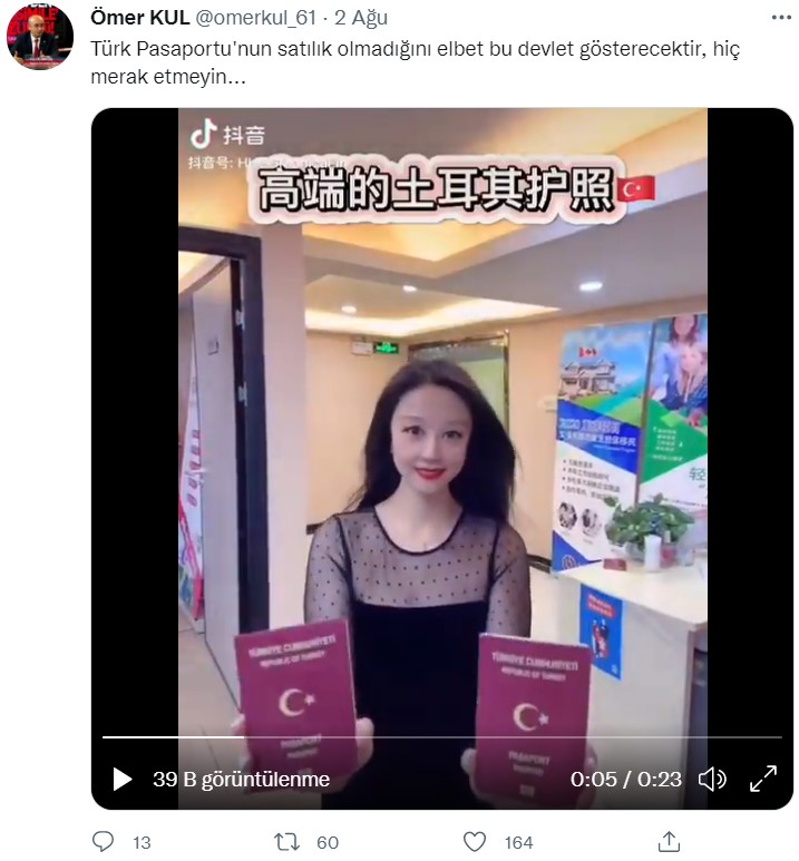 Twitter’da bir kullanıcının paylaştığı bir video yüzlerce etkileşim aldı. Kullanıcılar arasında hızla yayılan videoda bir kadının Çince bir takım tanıtımlar yaptığı görülüyor. Görüntüler “Çin’de mülk satın alındığında Türk vatandaşlığı alma hakkının verildiği” ve “Türk pasaportunun satışta olduğu” açıklamasıyla paylaşılmış. Hukuki olarak soru işareti bırakan bu iddianın arka planını araştırdık.