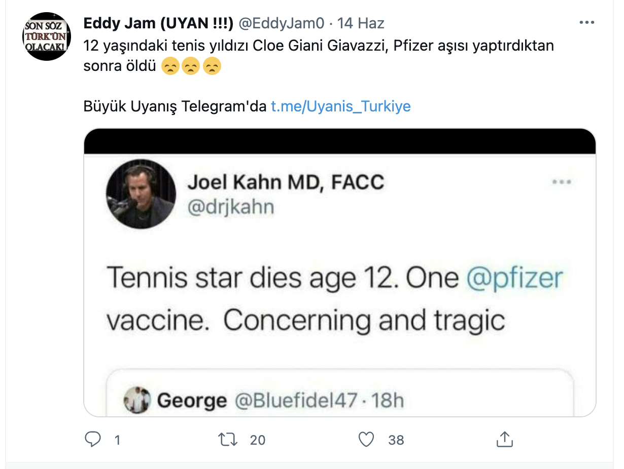 12 Haziran 2021 tarihinde 12 yaşındaki tenis yıldızı Cloe Giani Giavazzi’nin ölümü yabancı basında gündeme geldi. Gündeme geldikten sonra Twitter’da konuyla alakalı yeni bir iddia ortaya atıldı. Giavazzi’nin ilk Covid-19 aşısını vurulduktan sonra hayatını kaybettiği iddia edildi. Yani Giavazzi’nin Covid-19 aşısı sebebiyle öldüğü iddia edildi. Twitter’da bu iddia Türkiye’den de birkaç kişi tarafından dile getirildi.
