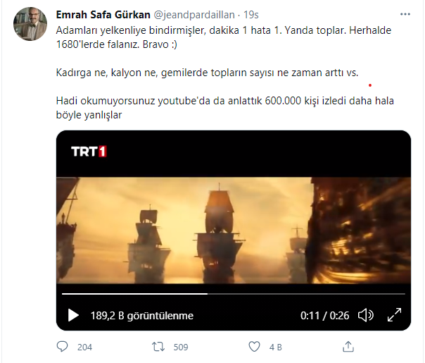 Gürkan, videodaki açıkça küreksiz olan ve borda kısmında toplara sahip oldukları göze çarpan gemilerin tarihi gerçekleri yansıtmadığını ve yapımın geçeceği 16. yüzyıl yerine ileriki dönemlerin gemilerini andırdıklarını iddia etti.