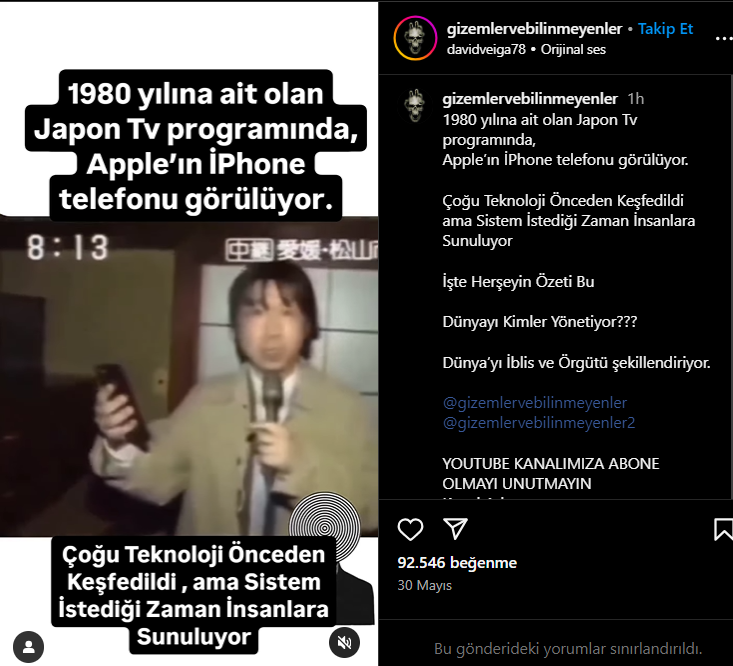 Geçmiş zamana ait olduğu öne sürülen ve şu anki teknolojilerin geçmişten geldiğine dair inançlar bazı komplo teorisyenleri tarafından sıkça gündeme getiriliyor. Bu teorilerden en popüleri şüphesiz Simpsonlar dizisi, birçok kez doğrulamasını yaptığımız dizinin geleceği önceden tahmin ettiği ve yaşanacak olan olayları önceden paylaştığı söyleniyor. Ancak araştırdığımızda elbette ki bunların gerçeği yansıtmadığı ve hatalı ilişkilendirildiği sonucuna ulaşıyoruz. Benzer şekilde bu iddia paylaşımında da akıllı telefonun 1980 yılında var olduğu ve kayıtlara geçtiği söylenmiş. Ancak bu paylaşımlardan kaçınmak ve gerçeğin izini sürmek için videonun kim tarafından paylaşıldığına ve kaynakların güvenli olup olmadığına dikkat edilebilir. Aynı zamanda videodan alınan ekran görüntüsü basitçe arama motorlarında aratıldığında da videonun gerçek kaynağına ulaşılabilir. Böyle videoların gündeme getirilmesi elbette ki sosyal medya kullanıcıları arasında kafa karışıklığı yarattığı gibi paylaşım örneklerini de artırıyor. Fakat böyle basit ipuçlarını takip ederek gerçeği öğrenmek mümkün.