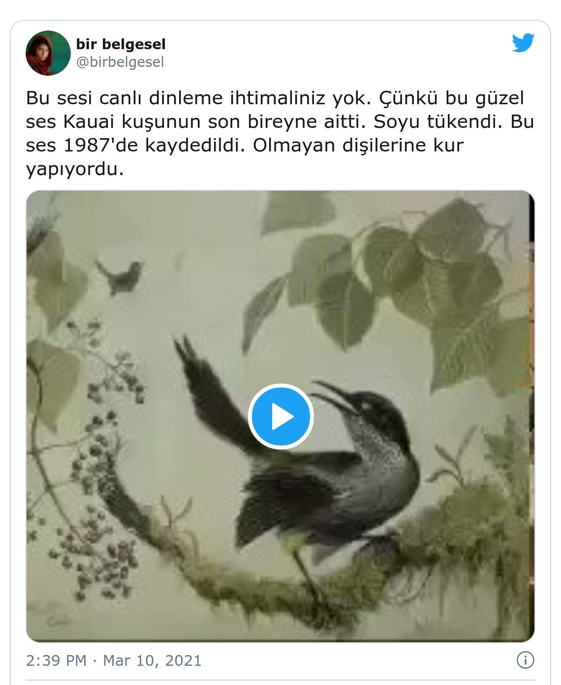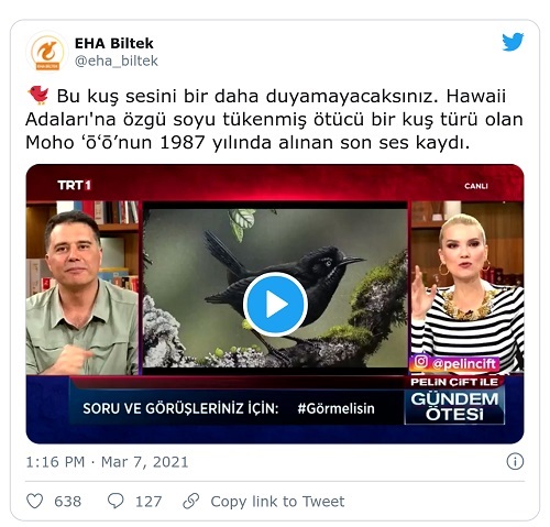 TRT 1’de Pelin Çift İle Gündem Ötesi programında tekrardan yayınlanarak ortaya çıkan 1987’de Nesli Tükenen Kauai Oo Kuşuna Ait Son Ses Kaydı İddiası Instagram‘da ve Twitter‘da karşılık bulmuştur.