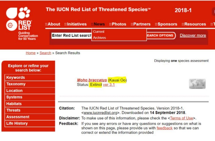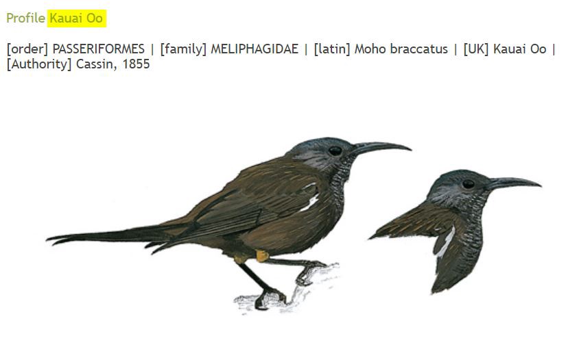 Dünya Doğayı Koruma Birliği (IUCN) Kırmızı Liste’sinde Hawaii’de yaşamış olan bu küçük kauai oo kuşunun neslinin tükendiğini görmek mümkün.