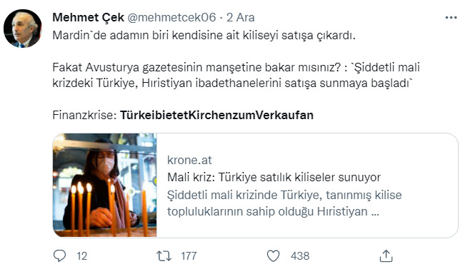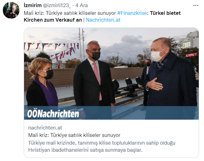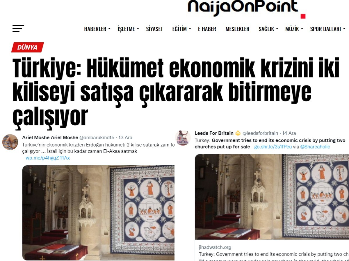 Bursa’daki Katolik Ermeni kilisesinin ve Mardin’deki Süryani kilisesi başta olmak üzere Türkiye’deki birçok kilisenin ekonomik sebeplerden dolayı satılığa çıkarıldığı iddiası sosyal medyanın gündeminde. Yüksek oranda ilgi gören bu çarpıcı iddia, sosyal medya kullanıcıları tarafından eleştiriliyor. Bir yandan da ”satılık kilise” iddialarının gerçekliğini sorgulayan kullanıcılar da var. Aralık 2021’de Avusturya merkezli Kronen Zeitung Gazetesi, Türkiye’nin mali kriz nedeniyle birkaç kilise sattığını iddia etti. Bu iddia dünya basınında da geniş yer tuttu. Fakat yerli haber ajansları ve sosyal medya kullanıcıları da son dönemde sıkça kiliselerin satıldığı iddiasını gündeme taşıyor.