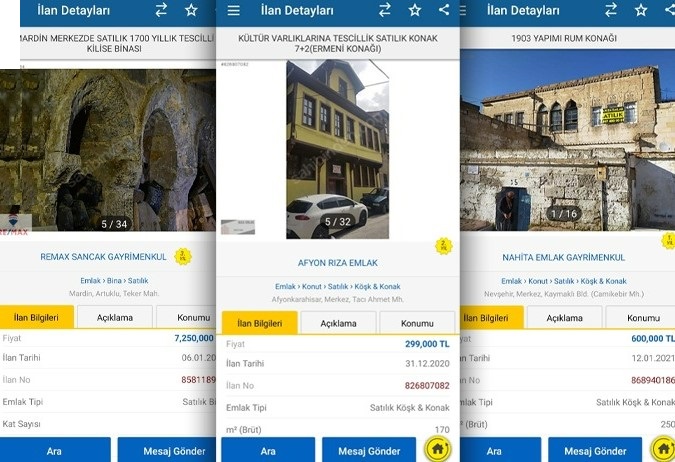Google’da tersten arama yaptığımızda, geçtiğimiz yıllarda iddia kaynağı kiliselerin dönem dönem satışa çıkarılarak bir süre sonra satış ilanlarının geri çekildiğini tespit ettik. Yıl 2021, kiliseler tekrar satılık. Ama bu kez satan kim ise ilanda fotoğraflar bile temsili kullanıyor. Aslında emlak satış sitelerinin çoğunda artık Ermeni ve Rum malları ile ilgili ilanlarda detayları göremeyeceğiniz biçimde uzaktan çekilmiş ya da sahte fotoğraflar kullanılıyor.