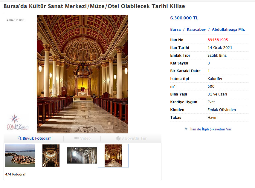 Google’da tersten arama yaptığımızda, geçtiğimiz yıllarda iddia kaynağı kiliselerin dönem dönem satışa çıkarılarak bir süre sonra satış ilanlarının geri çekildiğini tespit ettik. Yıl 2021, kiliseler tekrar satılık. Ama bu kez satan kim ise ilanda fotoğraflar bile temsili kullanıyor. Aslında emlak satış sitelerinin çoğunda artık Ermeni ve Rum malları ile ilgili ilanlarda detayları göremeyeceğiniz biçimde uzaktan çekilmiş ya da sahte fotoğraflar kullanılıyor.