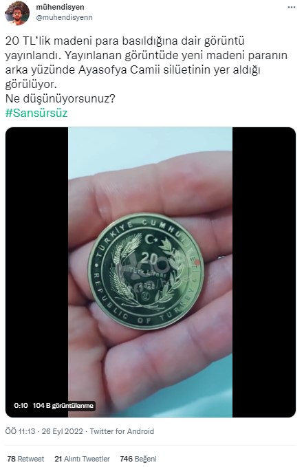 26 Eylül’de sosyal medyada paylaşılan bir gönderi doğrultusunda, üzerinde Ayasoyfa Camii silüetinin bulunduğu 20 TL’lik madeni para basıldığı öne sürüldü. Gündeme gelen iddia kısa süre içerisinde yayıldı.