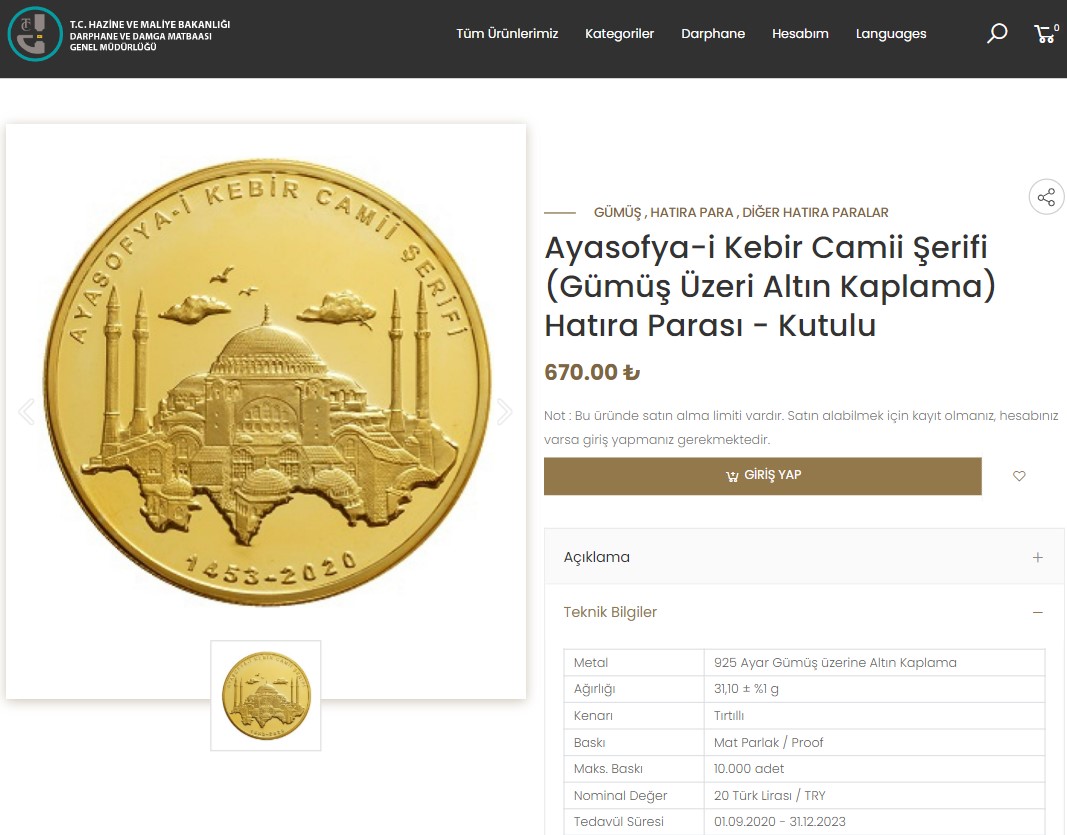 Konuyla ilgili Darphane ve Damga Matbaası Genel Müdürlüğü’nün resmi sitesinde yayımlanan bilgileri incelediğimizde, Ayasofya Camii hatıra parasına ilişkin detaylı bilgiye ulaşılabiliyor. Darphane’nin resmi satış mağazasına bakıldığında ise satışta olan hatıra parasıyla, iddia görüntülerinin eşleştiği anlaşılıyor. Böylece videoda görülen hatıra parasının ‘gümüş üzeri altın kaplama’ olduğu bilgisine ulaşıyoruz.