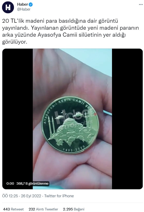 Twitter’da paylaşılan gönderide, “20 TL’lik madeni para basıldığına dair görüntü yayınlandı. Yayınlanan görüntüde yeni madeni paranın arka yüzünde Ayasoyfa Camii silüetinin yer aldığı görülüyor” ifadeleri kullanıldı.