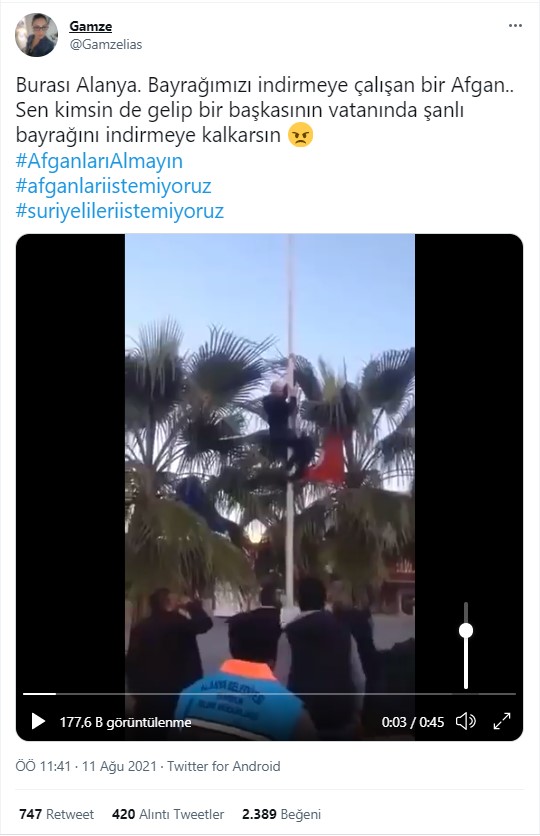 Üçüncü videoda ise bir kişi Türk bayrağını indirmeye çalışmaktadır. Fakat çevredeki kişilerce durdurulup linçe uğramaktadır. Video bir Twitter hesabı tarafından paylaşıldı ve paylaşımda “Burası Alanya. Bayrağımızı indirmeye çalışan bir Afgan.. Sen kimsin de gelip bir başkasının vatanında şanlı bayrağını indirmeye kalkarsın” dendi. Videonun ekran görüntüsünü yine tersine arattığımızda videonun 12 Mart 2018’de paylaşıldığını gördük. Bu tarihteki İhlas Haber Ajansı, Sözcü ve Milli Gazete’deki haberlere baktığımızda akli dengesinde yer olmayan bir kişinin Türk bayrağını indirmeye çalıştığını ve bu sebeple linç girişimine uğradığı anlaşıldı. Haberlerde bu kişinin etnik kökeni hakkında herhangi bilgi yer almamaktadır. Dolayısıyla kişinin Suriyeli, Afgan veya herhangi bir sığınmacı olup olmadığı bilinmemektedir.