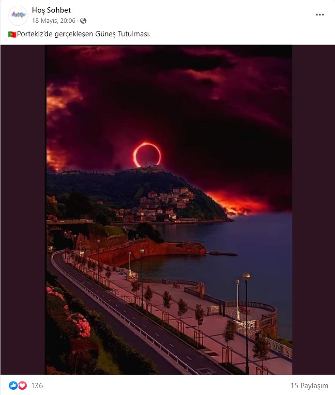 Görseldeki yer Portekiz değil, İspanya’nın San Sebastián kenti. Görsele kızıl hava ve Güneş tutulması efekti sonradan eklenmiş.