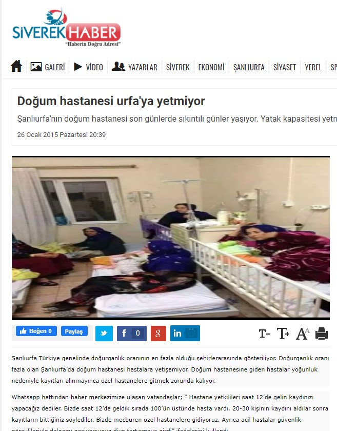 İlk fotoğraf tersine aratıldığında Twitter’da fotoğraf ile ilgili başka paylaşımlar yapıldığını gördük. Atılan tweetlerde buranın Şanlıurfa Çocuk Hastalıkları Hastanesinden olduğu belirtiliyor ve fotoğrafın 2010’dan sonrasında, yani AK Parti hükümeti döneminde, çekildiği anlatılıyor. Fotoğraf aynı zamanda Siverek Haber isimli haber sitesinde paylaşıldığını bulduk. (1. Görsel) Haber sitesinde bu fotoğrafın Whatsapp ihbar hattından geldiği ve Şanlıurfa Çocuk Hastalıkları Hastanesi’nin çok dolu olduğu söyleniyor. İlgili haber, sitede 26 Ocak 2015’te paylaşılıyor.