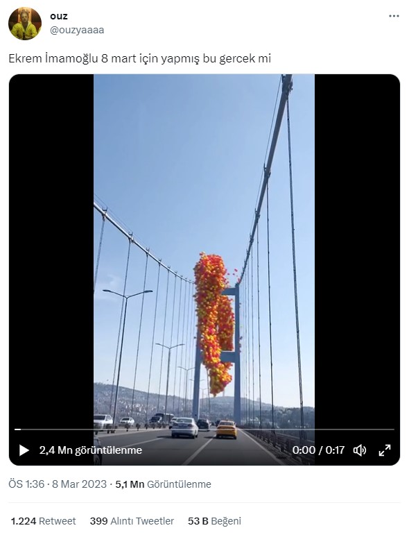 8 Mart Dünya Kadınlar Günü dolayısıyla İBB’nin 15 Temmuz Şehitler Köprüsü üzerinde balon gösterisi yaptığı iddia edilen video, sosyal medyada kısa sürede viral olmuştu.
