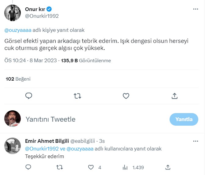 Bir kullanıcı işbu videodaki görsel efekti yapan kişiye teşekkür etmiş. Yorumun hemen altında bir bilgisayar tabanlı görsel sanatçı olan Emir Ahmet Bilgili’nin bu ifadeye karşılık olarak teşekkür ettiğini görüyoruz.