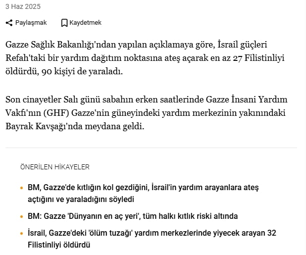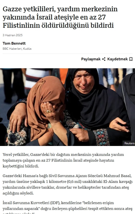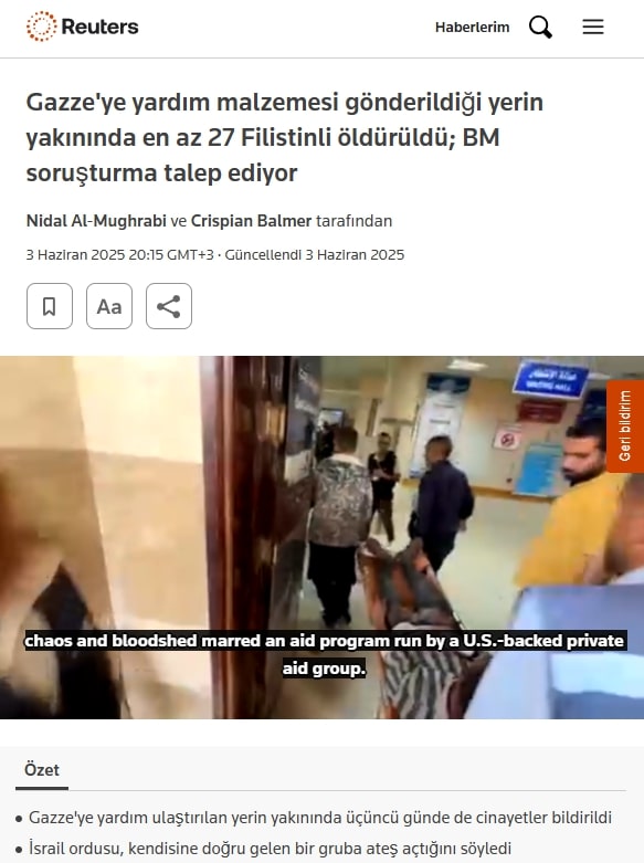 “İsrail yine yardım kuyruğunu hedef aldı” yazan haber görseli A Haber tarafından 3 Haziran 2025’te paylaşılmış. Aynı tarihte Al Jazeera, BBC, Reuters gibi haber ajansları da aynı haberi hazırlamıştı.
