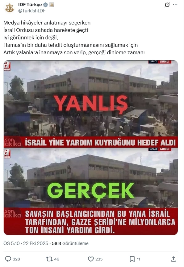 İsrail Savunma Kuvvetleri’nin resmi X hesabı IDF Türkçe, A Haber’in “İsrail yine yardım kuyruğunu hedef aldı” başlıklı haberini “YANLIŞ” ibaresi ekleyerek paylaşmış. Görselin altına “İsrail tarafından Gazze’ye milyonlarca ton insani yardım girdi” yazılı bir haber görseli eklemiş. Filistin ve İsrail arasındaki ateşkesten sonra yapılan bu paylaşım güncel bir haber görseli kullanıldığı algısı oluşturmuş. Haberin bağlamını inceledik.