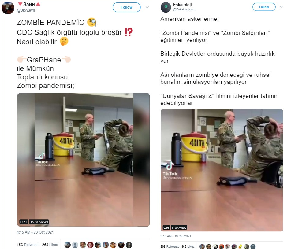 Amerikan askerlerinin bulunduğu bir odada alınan bu video kaydında, masanın üstünde bulunan “Preparedness 101: Zombie Pandemic” isimli bir kitapçığın, olası bir zombi salgınına hazırlık olarak Amerikan ordusunun eğitiminin bir parçası olduğuna dair çeşitli iddialar görülmekte.