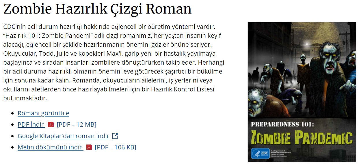 Hastalık Kontrol ve Korunma Merkezleri’nin (CDC) web sitesinde bu kitabı aradığımızda 2012 basımı bir çizgi roman olduğunu tespit ettik. Romanda, zombi salgını sonucu insanların başı derde giriyor yani “zombi salgınına hazırlık” başlığıyla basılan bir eğitim ya da tatbikat kitabı değil. Kitabın PDF halini CDC’nin adresinde bulmak mümkün.