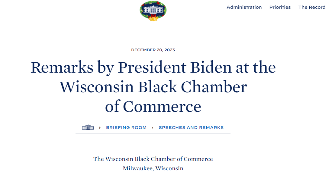 Sosyal medyada yer alan videonun kaynağına ulaşmak için arama motorları üzerinde anahtar kelimelerle araştırma yapıyoruz. Arama sonuçlarında, Beyaz Saray tarafından paylaşılan metne ulaşıyoruz. Bu metinde yer alan bilgilerden hareketle videonun, 20 Aralık 2023’te Joe Biden’ın Wisconsin Black Chamber of Commerce’de (Siyah Ticaret Odası) yaptığı bir açıklamadan alındığını anlıyoruz. Söz konusu videonun geniş açıdan çekilen haline bakıldığında Başkan Biden, sahnenin arkasında yer alan kişileri selamlıyor.