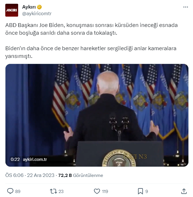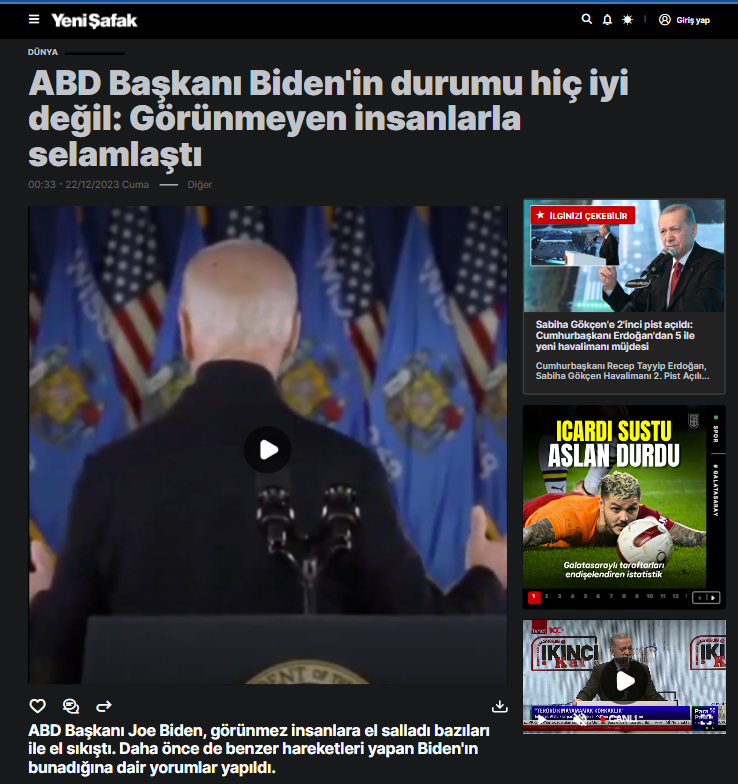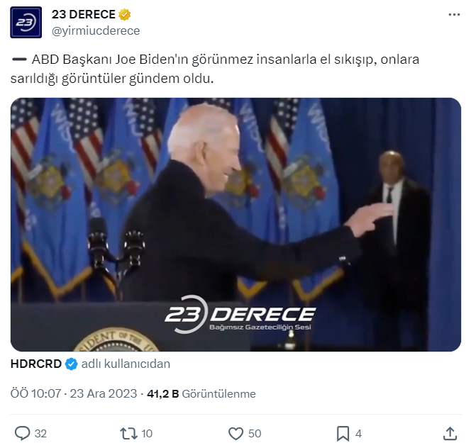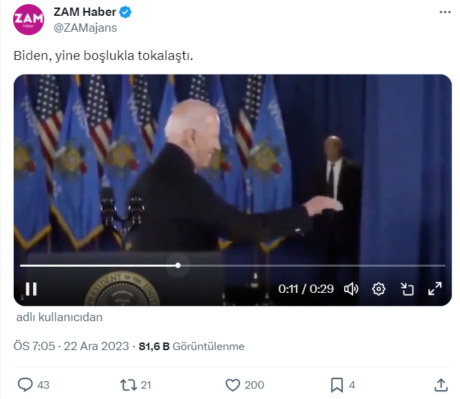 Gün geçmiyor ki ABD Başkanı Joe Biden yine bir iddianın konusu olmasın. Biden, hakkında özellikle de yaşının ön plana çıkarıldığı çeşitli iddialarla gündeme sıklıkla geliyor. Sosyal medyada ve haber siteleri tarafından paylaşılan videoda, Biden’ın konuşmasını bitirdikten sonra arkasını dönerek boşluğu selamladığı iddia edildi.