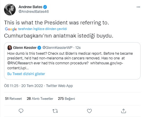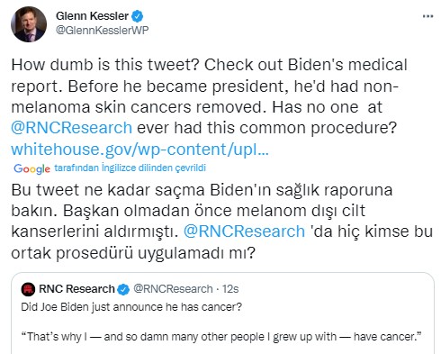 Bu ifade akılları karıştırdı ve bu iddianın yayılmasına sebep oldu. Bunun üzerine Beyaz Saray’ın Basın Sekreteri Yardımcısı Andrew Bates Washington Post editörü Glenn Kessler’in tweetini alıntılayarak Biden’ın eskiden kanser olmasını ima ettiğini belirtti. Kessler ise tweetinde Biden’ın Başkan olmadan önceden cilt kanseri olduğunu ve iyileştiğini vurguladı ve Biden’ın konuşmasında bunu belirttiğini ifade etti. Ayrıca Kessler 19 Kasım 2021’de yayınlanan Biden’ın sağlık raporunu paylaştı. Raporda geçmişte Biden’ın non melanom cilt kanseri olduğunu ve bunun Başkan olmadan önce alındığı belirtiliyor. Şu an ise cilt kanseri şüphesini bulunmadığını da bildiriyor. Bundan hareketle Biden’ın konuşmasında güncel olarak kanser olduğunu itiraf ettiği iddiasının yanlış olduğunu söyleyebiliriz.