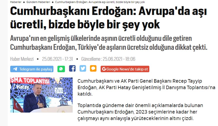 Cumhurbaşkanı Recep Tayyip Erdoğan 25 Haziran 2021’de AK Parti Hatay Genişletilmiş İl Danışma Toplantısı’nda yaptığı konuşmada Avrupa’nın en gelişmiş yerlerinde ve ABD’de de Covid-19 aşısının ücretli olduğunu dile getirdi. İngiltere’de ise 100 sterlin gibi bir rakama Covid-19 aşısı yapıldığını iddia etti.