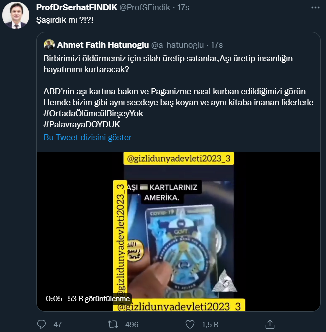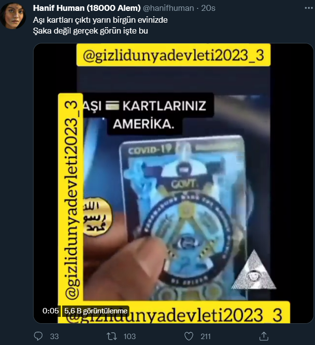 Covid aşılarıyla alakalı hemen her gün bir iddiayla karşılaşıyoruz. Birkaç gündür gündemde olan bir video da bu iddialardan birisi. Söz konusu videoda bir kişi elinde tuttuğu kartı gösteriyor. Kartın üzerinde Masonluk simgesi ve ezoterik örgütlenmelerle ilişkilendirilen Horus’un gözü görülmekte. İddia sahibi kullanıcılar, bu aşı kartlarının Amerika’da aşı olanlara verildiğini not düşerek paylaşmış.