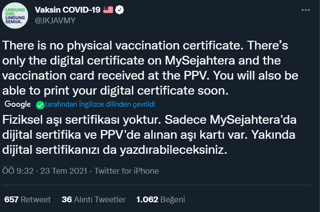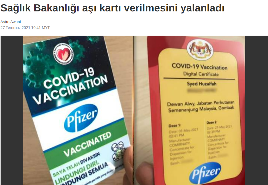 Kişiye özel olarak basılan bu -sözde- aşı kartlarının arkasında aşıyı olanın ismi, nerede ve hangi aşıyı olduğu 1. doz ve 2. doz kısmında yazmaktadır. Kullanıcıların açıklamaları Malezya dilinde yapmasından bu kartların Malezya’da üretildiğini görüyoruz. Kartların üstünde bulunan simgeyi araştırdığımızda bunun Malezya Sağlık Bakanlığı tarafından verildiğinin iddia edildiği anlaşılmaktadır.
