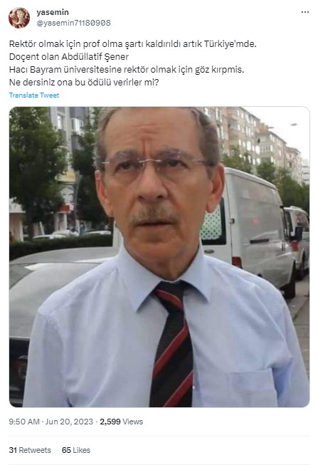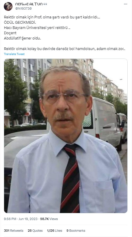 Ayrıca Sözcü’den Başak Kaya’nın haberine göre Doç. Dr. Abdüllatif Şener’in Ankara Hacı Bayram Veli Üniversitesi’nin rektörü olmak istediği konuşuluyor. Bunun üzerine sosyal medyada rektör olmak için profesörlük şartının kaldırıldığı ve Şener’in Hacı Bayram Veli Üniversitesi’ne rektör olarak atandığı iddia edildi.
