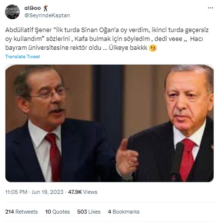 CHP 27. Dönem Konya Milletvekili Abdüllatif Şener, 14 Mayıs seçimlerinden sonra CHP’den istifa ettiğini açıklamış; hatta ilk turda Sinan Oğan’a oy verdiğini, ikinci turda ise geçersiz oy kullandığını belirtmişti. Son olarak ilgili açıklamalarıyla ilgili ‘Beni sorgulayanları biraz rahatlatmak için, biraz da kafa bulmak için söyledim.’ diyen Şener, haliyle son dönemde sosyal medyada en çok konuşulan isimler arasında yer alıyor.