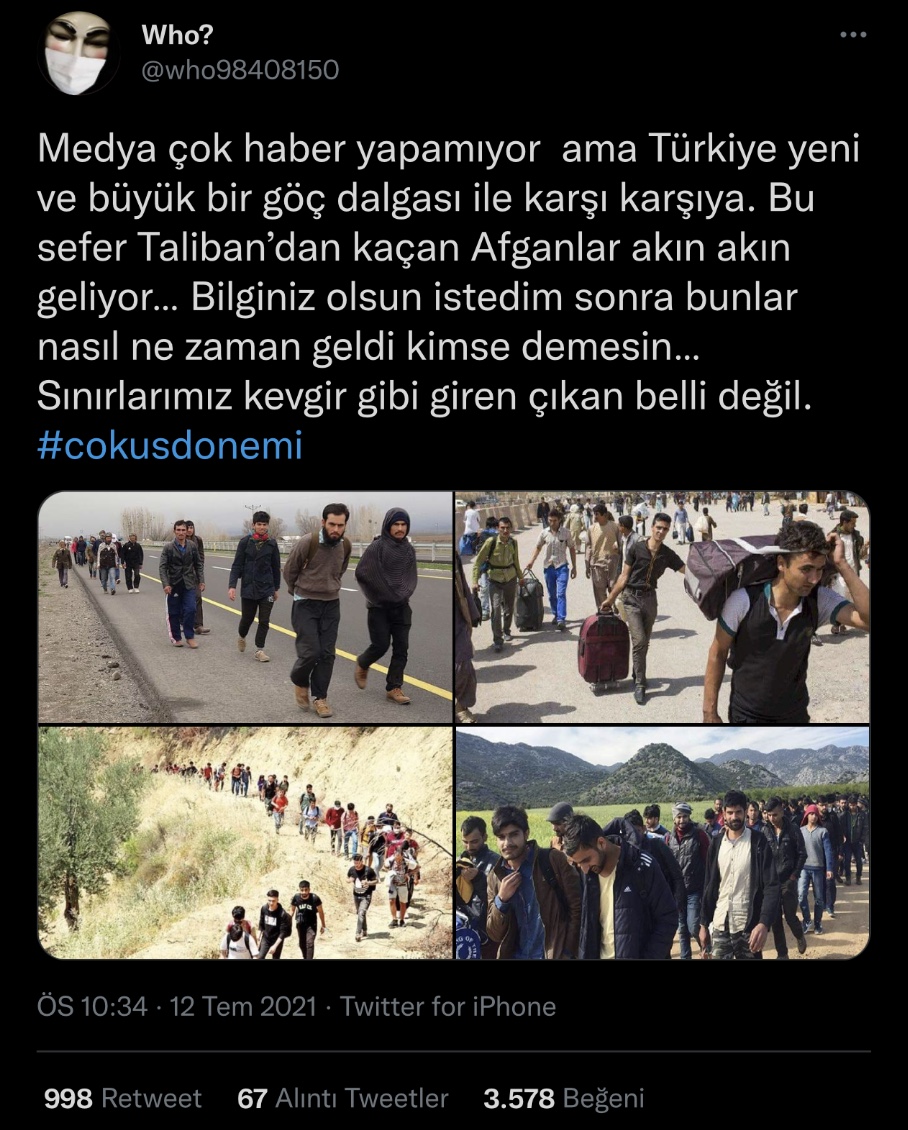 Afgan uyruklu sığınmacıların Türkiye’ye sığınmak üzere olduklarını yönünde iddialar birçok sosyal medya ve haber mecrası tarafından paylaşıldı. En çok etkileşim alan paylaşımlara @incisözlük adlı sayfanın içeriği örnek olarak gösterilebilir. Gündemde yankı uyandıran görsel sosyal medya kullanıcıları tarafından çeşitli yorumlar getirilerek eleştirildi. Fotoğrafın düşük çözünürlüğü, fotoğraftaki kişilerin kıyafetlerinin mevsimin dışında olduğu gibi birçok gerekçeye dayanarak fotoğrafın güncel olmadığı yönünde getirilen eleştiriler var. Sosyal medyada Afganistan’dan Türkiye’ye göç dalgası olduğu iddiasına dayanarak paylaşılan başka fotoğraflar da var. iddia kaynağı fotoğrafı ve güncel olduğu iddia edilip sosyal medyada yer alan Afganistanlı sığınmacılara ait fotoğrafları sizler için araştırdık.