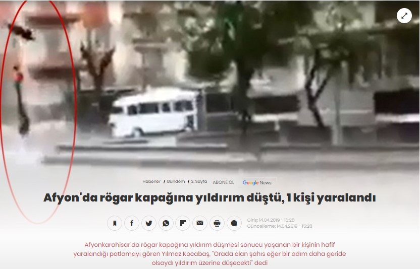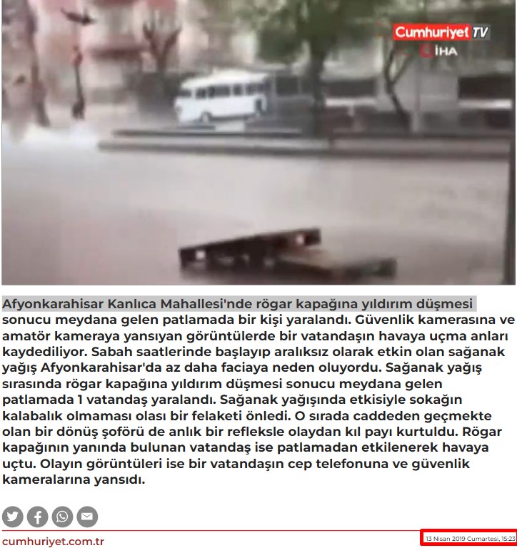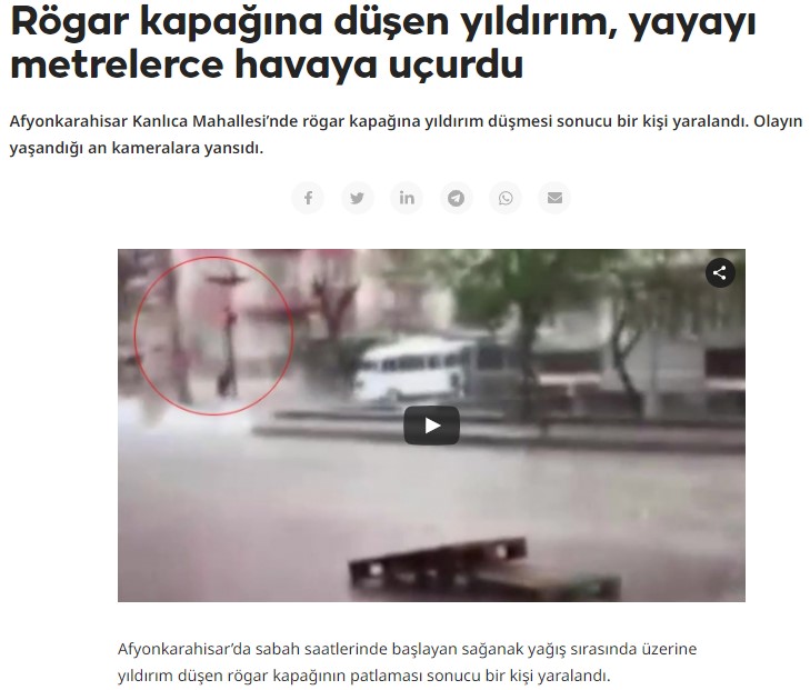 Haber kaynaklarında, söz konusu olay görüntülerine ilişkin detaylara baktığımızda sağanak yağışın şiddetli olduğu Afyonkarahisar’ın Kanlıca Mahallesi’nde rögar kapağına yıldırım düştüğü anı ve sonrasında da meydana gelen patlamayı gösterdiği belirtiliyor. Bununla birlikte yaşanılan patlama nedeniyle havaya uçtuğu görülen kişinin yaralandığı bilgisi de haberler de yer alıyor.