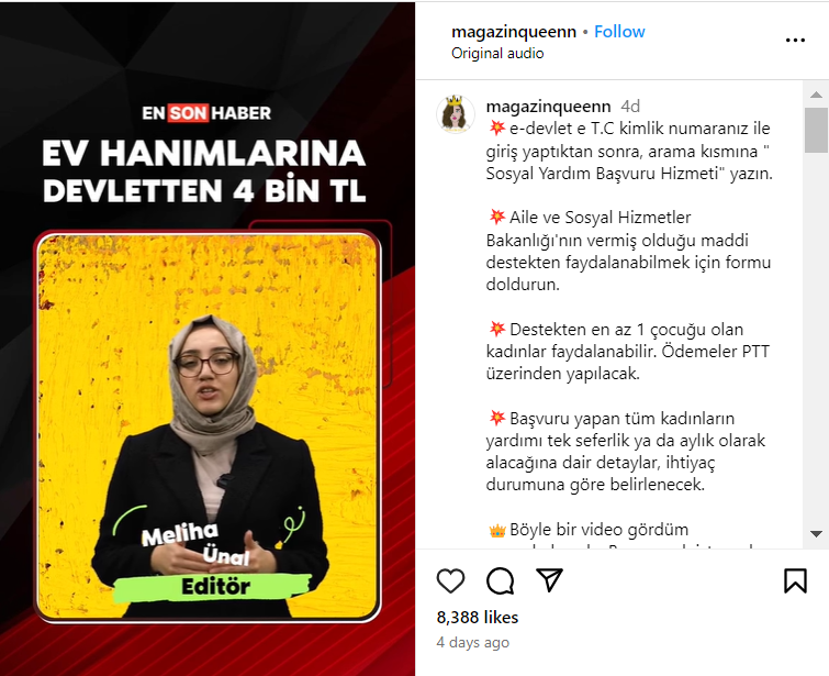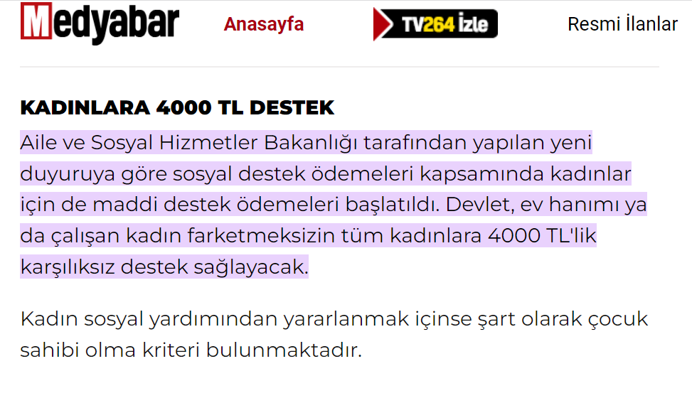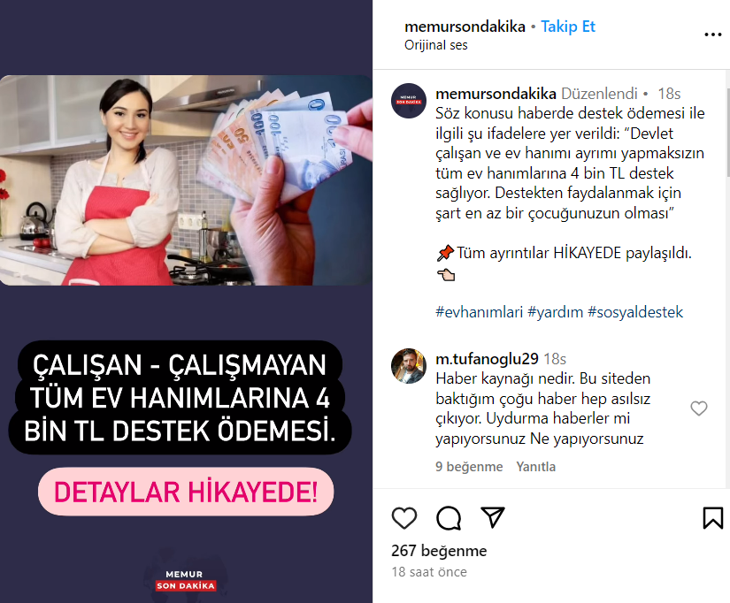 10 Aralık 2023’te Instagram’da bir haber kanalı aracılığıyla paylaşılan iddiaya göre devlet, çalışan ya da ev hanımı ayrımı yapmaksızın tüm kadınlara 4 bin TL nakdi yardım yapıyor. Bilgilendirmede destekten faydalanmak için tek şartın kadının en az 1 çocuğunun olması olduğu da eklenmiş.